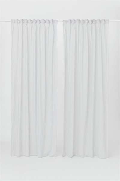 Пара шарфов-занавесок из органического смесового хлопка и льна. С многофункциональной тесьмой для четырех различных вариантов подвешивания: с петлями непосредственно на карнизе, с крючками для пальцев, крючками с четырьмя пальцами или в современном стиле. Крючки не включены.