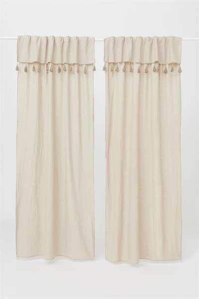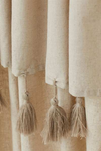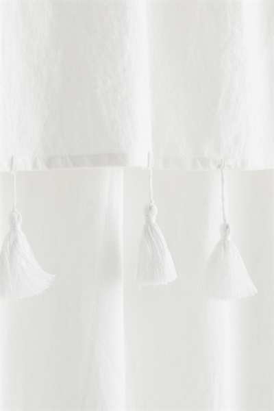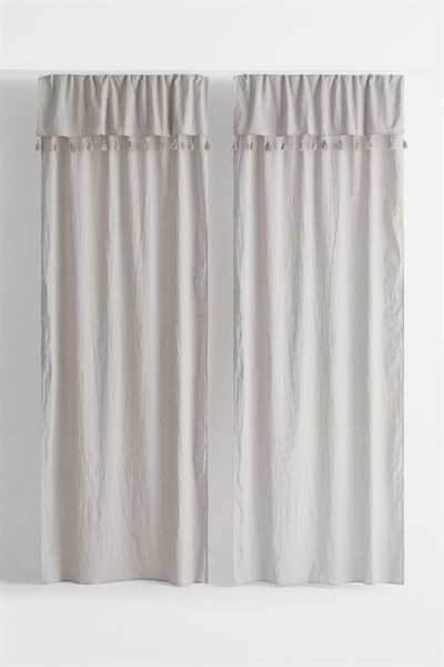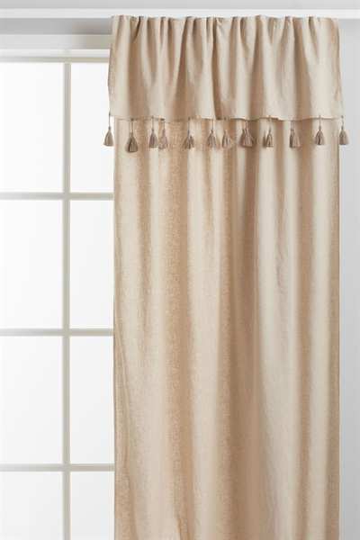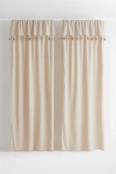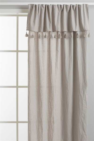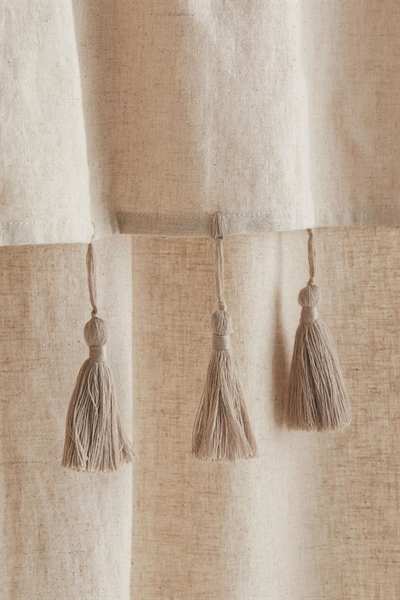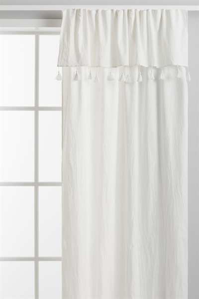 Пара шарфов-занавесок с кисточками вверху из смесовой ткани льна и хлопка. С многофункциональной лентой для четырех различных вариантов подвешивания: с петлями непосредственно на карнизе, с крючками для пальцев, крючками с четырьмя пальцами или в современном стиле. Крючки не включены.
