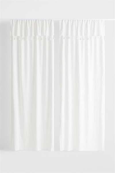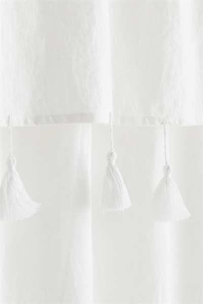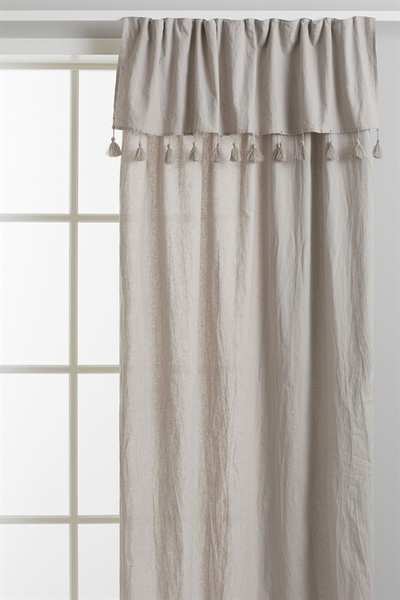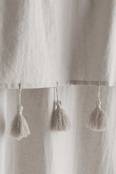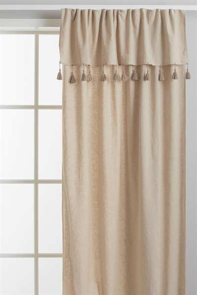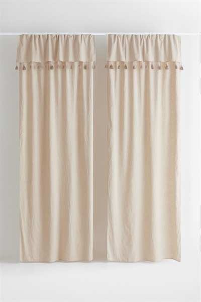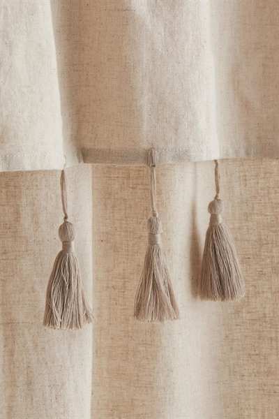Пара длинных портьер из льняной и хлопчатобумажной ткани с кисточками вверху. Многоходовой заголовок для четырех различных вариантов подвешивания: на карнизе с петлями для штор, с помощью крючков для штор, с крючками с четырьмя лапками или в современном стиле волны. Крючки в комплект не входят.