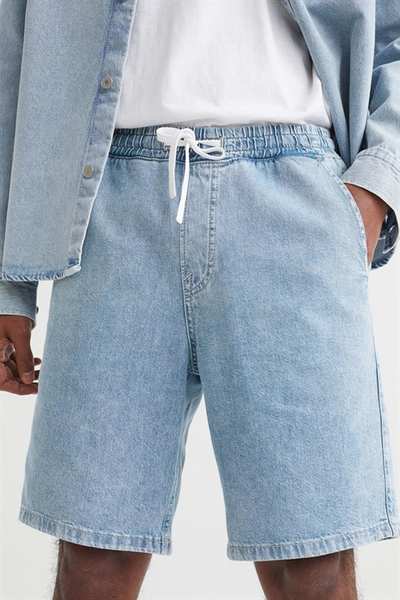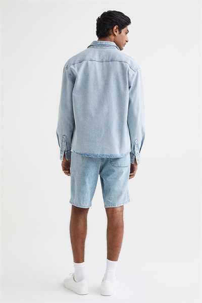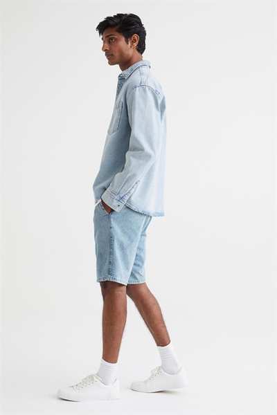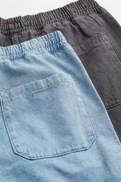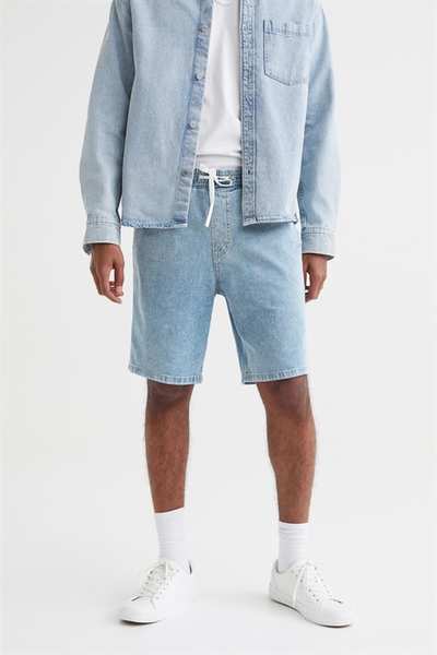 Шорты-джоггеры из плотного хлопкового денима. Эта модель имеет эластичный пояс нормальной высоты на кулиске с имитацией ширинки, боковые карманы и открытый задний карман сзади. Прямая, почти до колена нога.