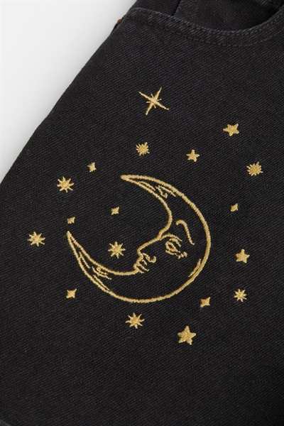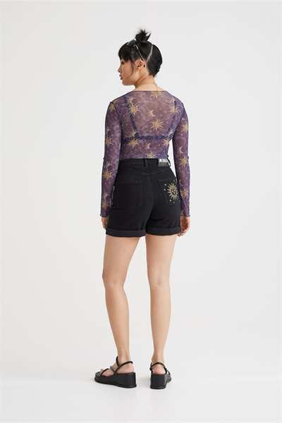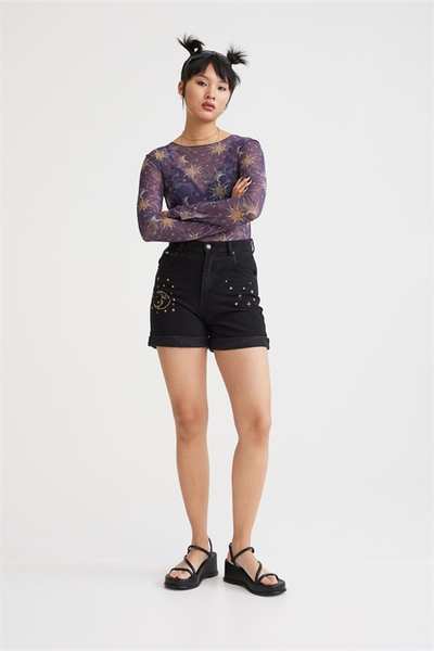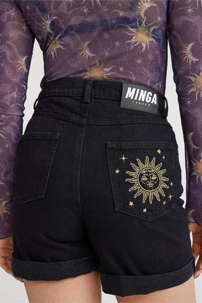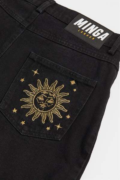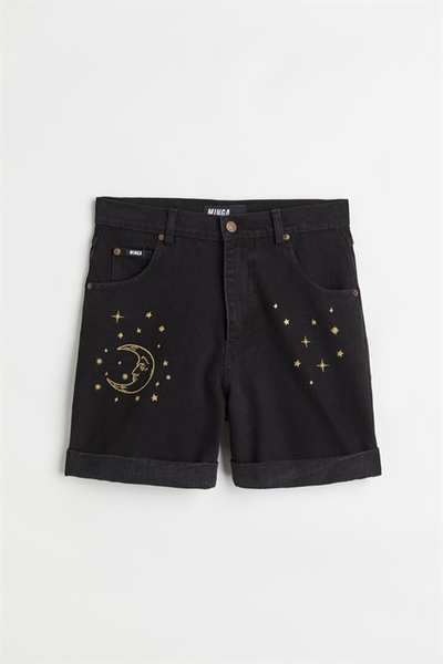 Черные джинсовые шорты с вышивкой Sun & Moon спереди и сзади, подвернутым краем, классическими 5 карманами и петлями для ремня.