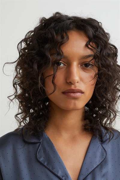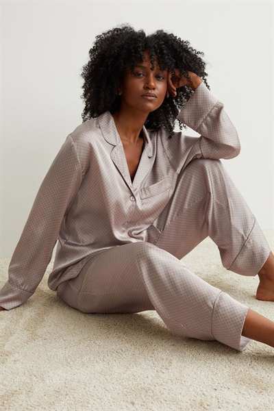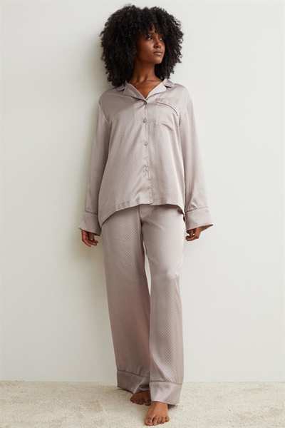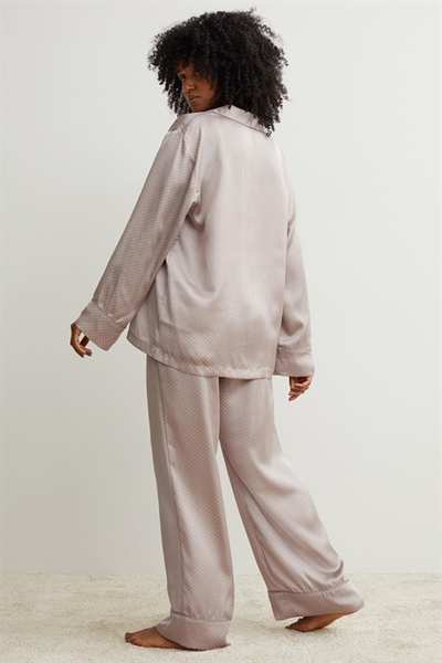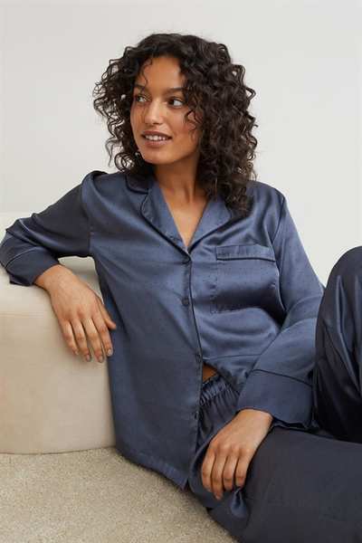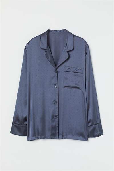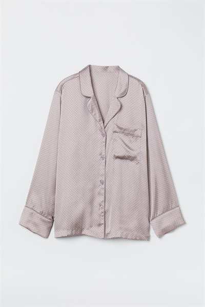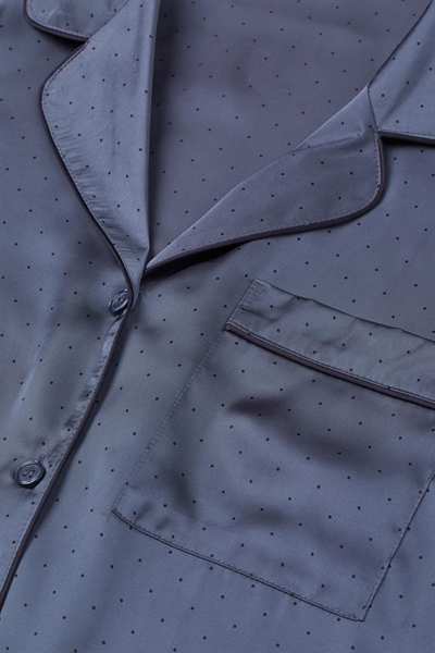 Ночная рубашка с длинными рукавами из мягкого струящегося атласа. Воротник с лацканами, пуговицы спереди, открытый нагрудный карман и прямой подол.