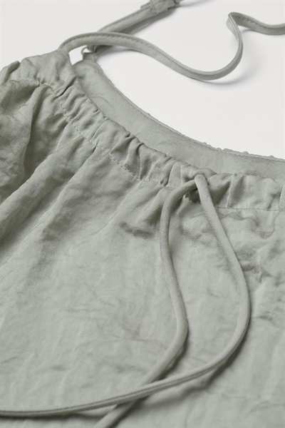 Пижама с топом и штанами до икры из мягкого атласа. Верх имеет глубокий вырез горловины на кулиске и узкие регулируемые бретели. Брюки имеют эластичный пояс нормальной высоты с узкой оборкой вверху и прямые широкие штанины.