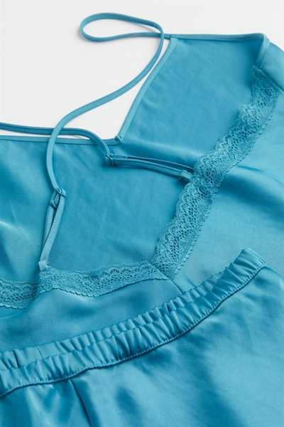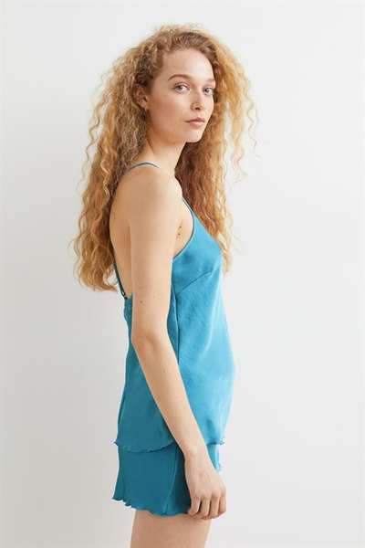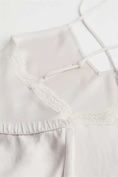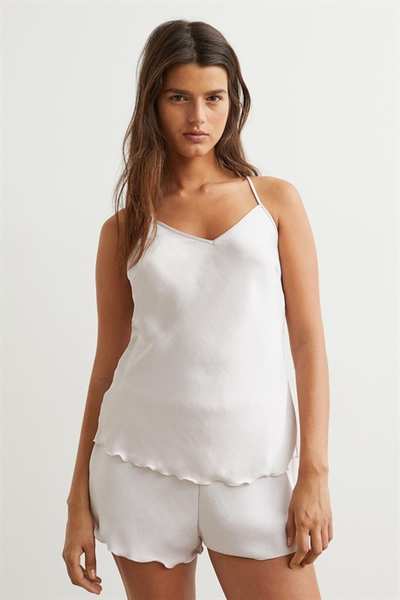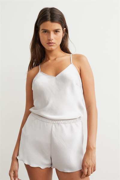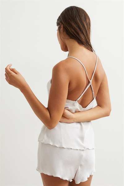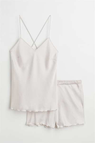 Пижама с топом без спинки и шортами из эластичного атласа. Топ с V-образным вырезом, кружевной каймой сзади и очень узкими регулируемыми бретелями, перекрещивающимися сзади. Край оверлока на подоле. Шорты имеют эластичный пояс и оверлочные края на концах штанин.
