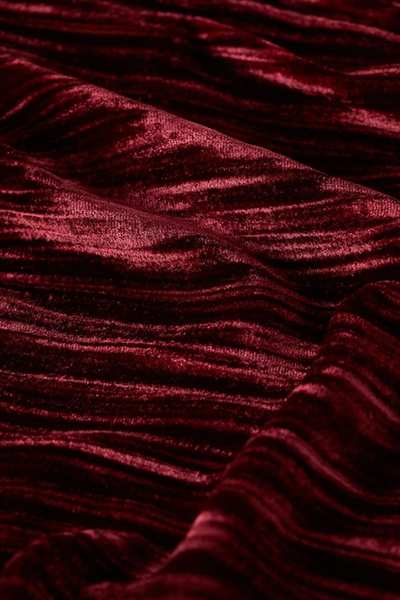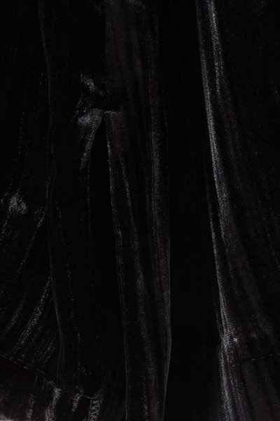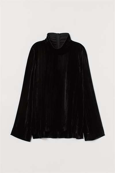 Рубашка с длинными рукавами из мягкого мятого бархата из смеси вискозы и шелка. Рубашка имеет высокий воротник с оверлоком, потайную молнию сзади со сборками сверху, прямые, широкие рукава и разрезы по бокам. Чуть длиннее спина.