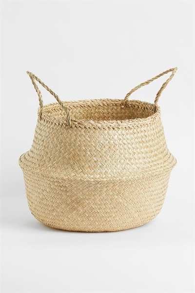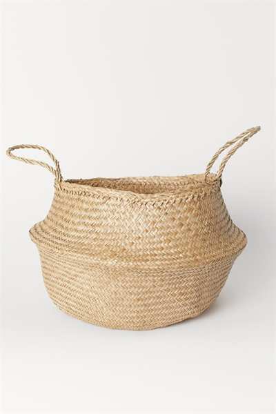 Большая круглая корзина для хранения из плетеных водорослей. Объем корзины можно увеличить, потянув за две ручки для переноски. Высота 19/33 см, диаметр дна 30 см, диаметр верха 33/40 см.