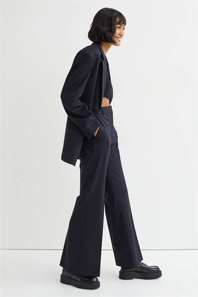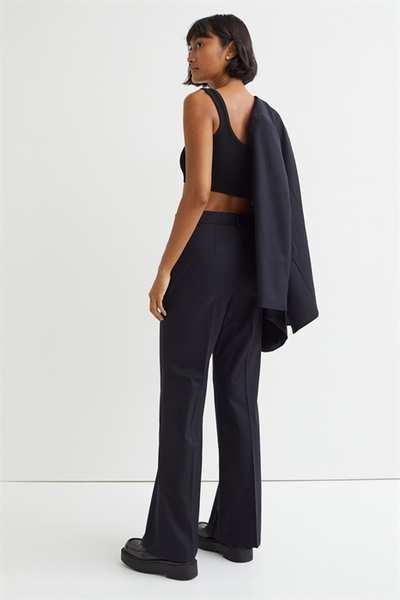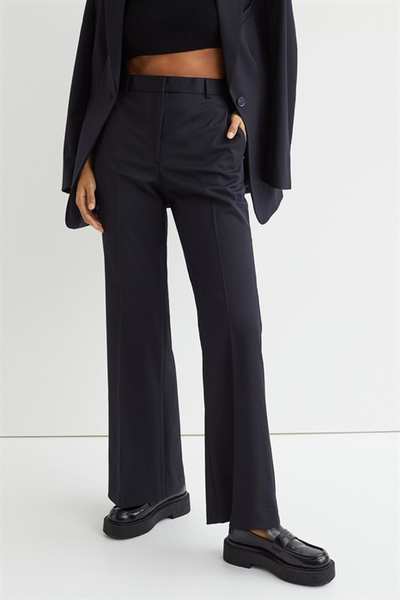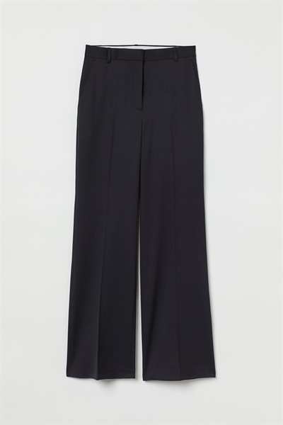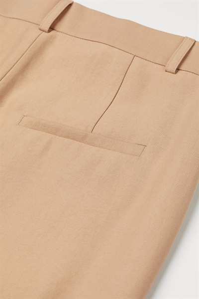 Брюки из смесовой ткани лиоцелла облегающего кроя: обычная посадка, расклешенные штанины с острыми складками, косые боковые карманы и прорезной карман сзади. Пояс с застежкой на крючок и молнию.