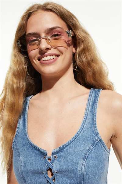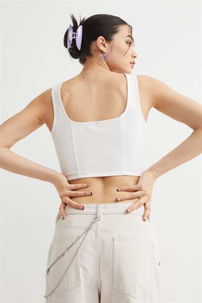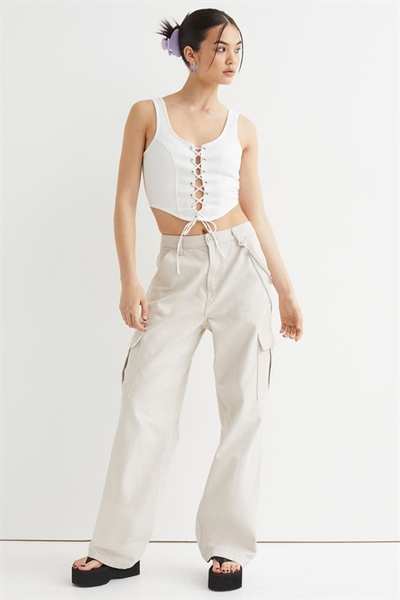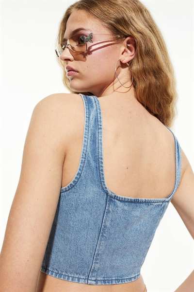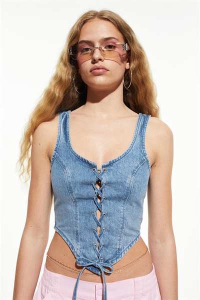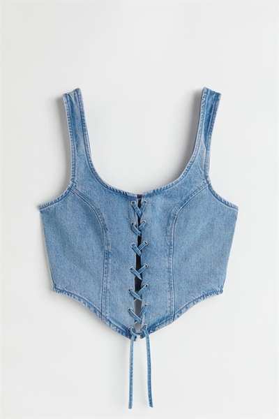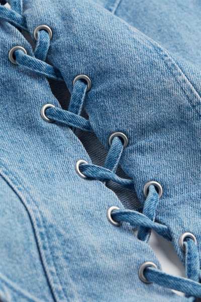 Облегающий кроп-топ из плотного хлопкового денима с широкими бретелями и шнуровкой спереди.