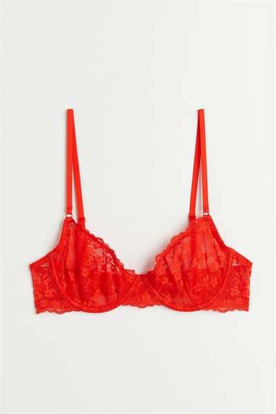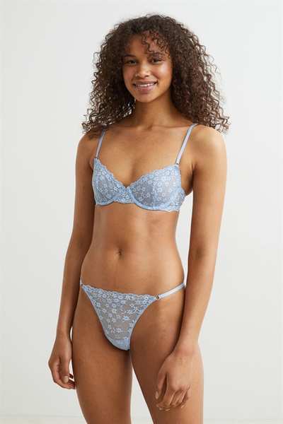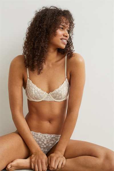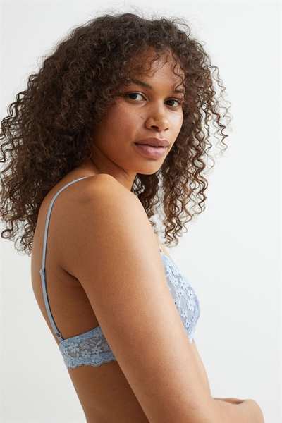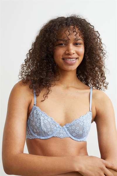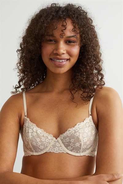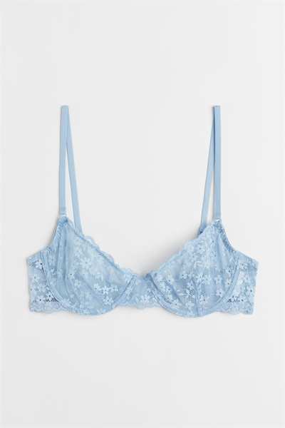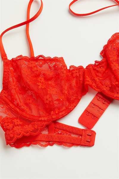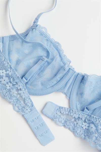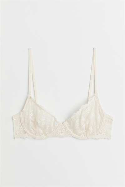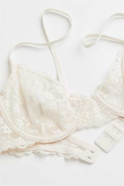 Кружевной бюстгальтер без подкладок на косточках с чашечками на сетчатой ??подкладке, которые придают бюсту естественную форму и легкую поддержку. Регулируемые бретели и застежка на крючок сзади.