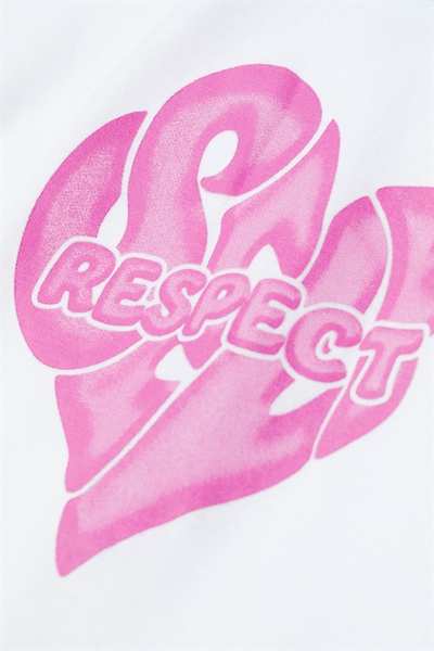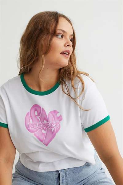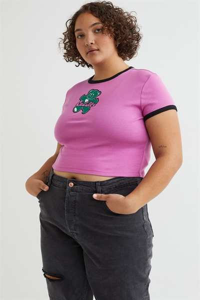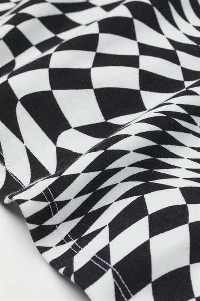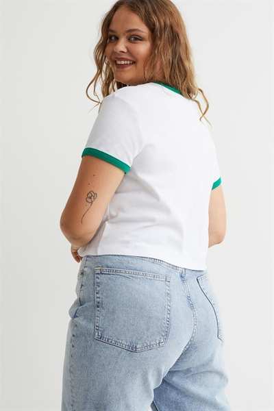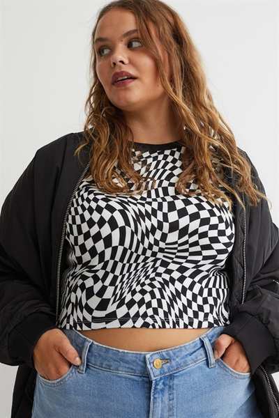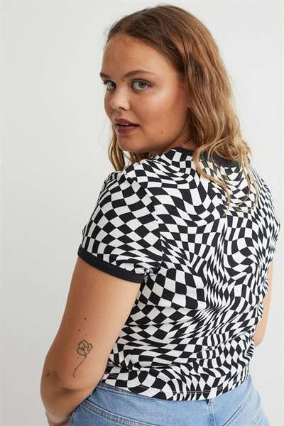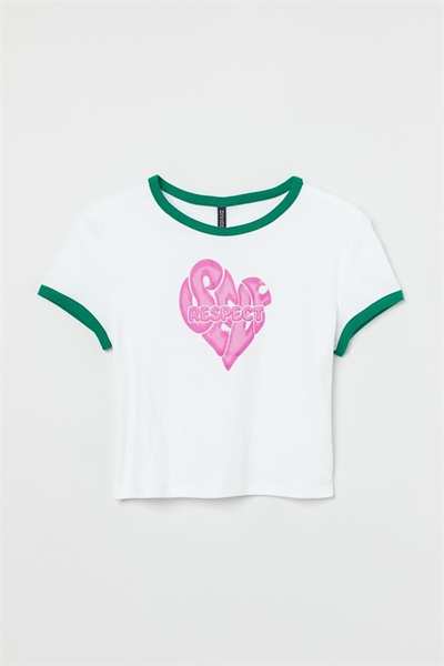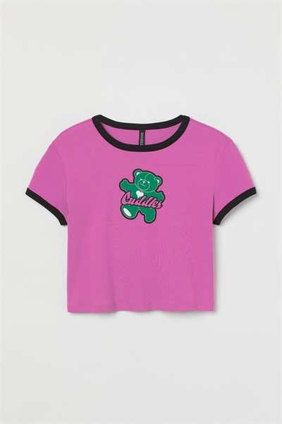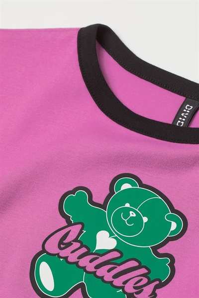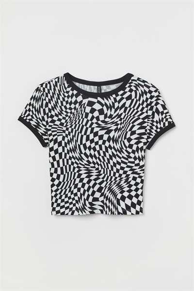 Короткая облегающая рубашка из мягкого хлопкового трикотажа с принтом. Детали: круглый вырез горловины, короткие рукава, окантовка по горловине и манжетам.