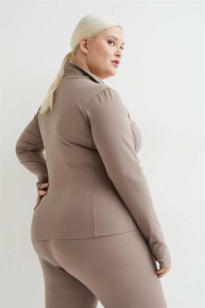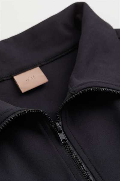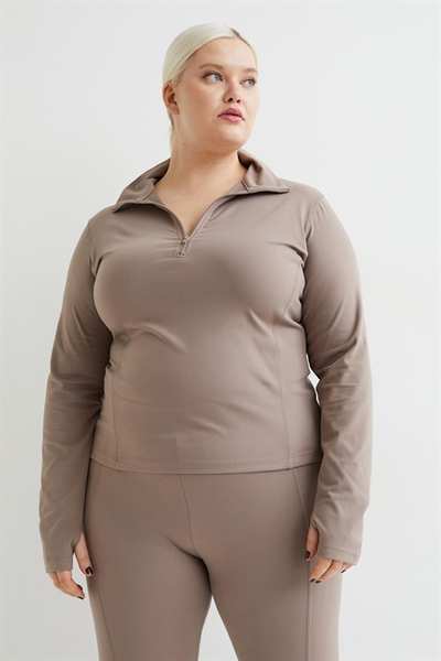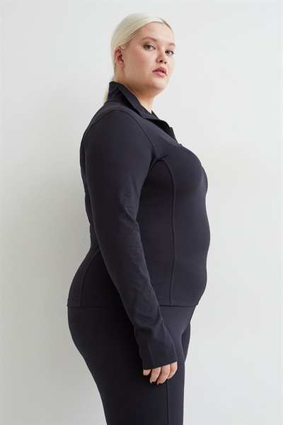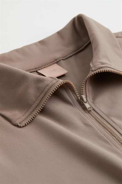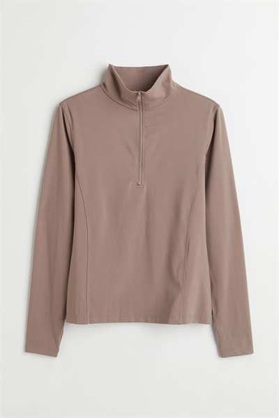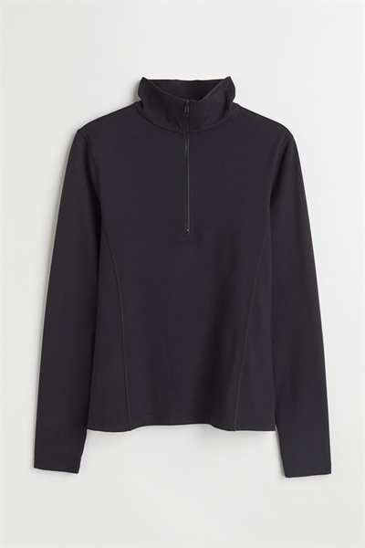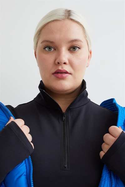 Облегающая рубашка из джерси, которая также идеально подходит для ношения под другими предметами одежды. Рубашка имеет высокий воротник, короткую молнию и очень длинные рукава с прорезями для больших пальцев.