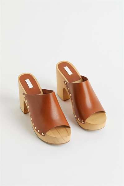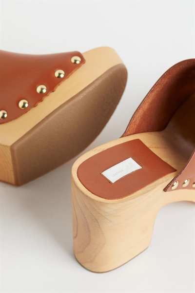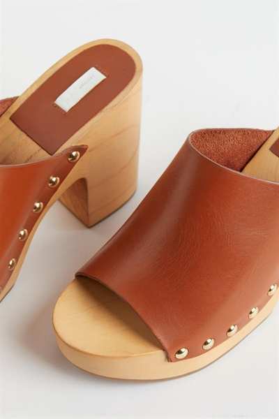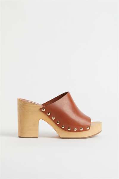 Сабо с широкими кожаными ремешками на щиколотках и яркими металлическими заклепками. Высокий блочный каблук.