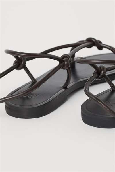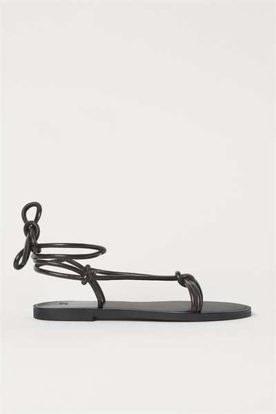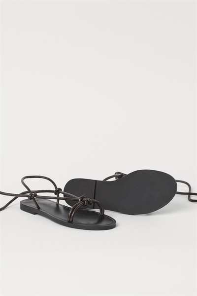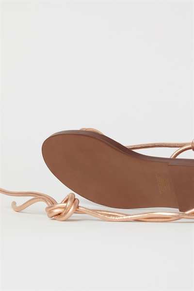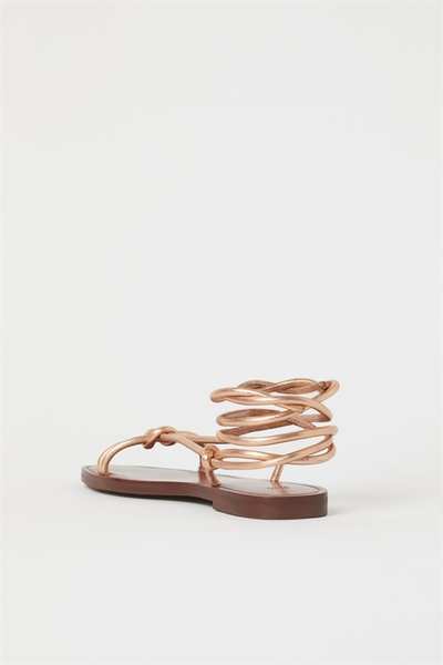 Сандалии из мягкой кожи с узкими ремешками спереди и длинными узкими ремешками, которые завязываются вокруг щиколотки. Кожаная стелька.