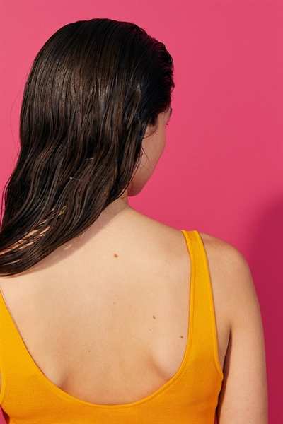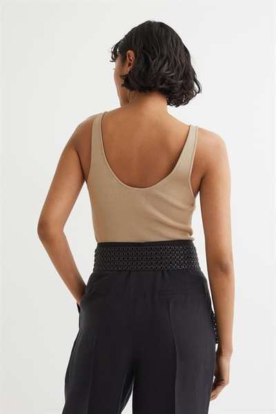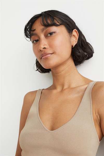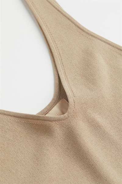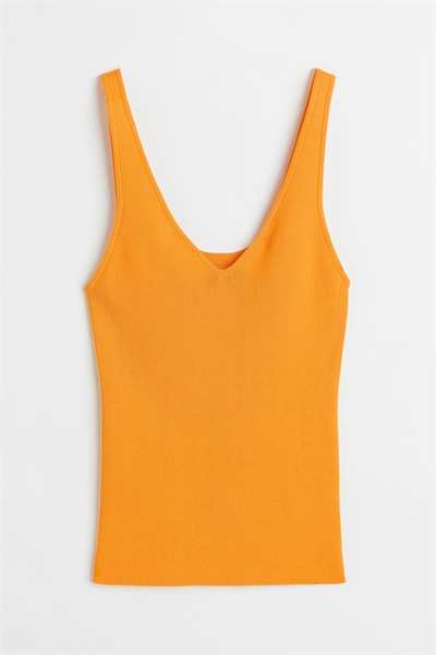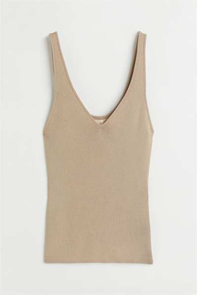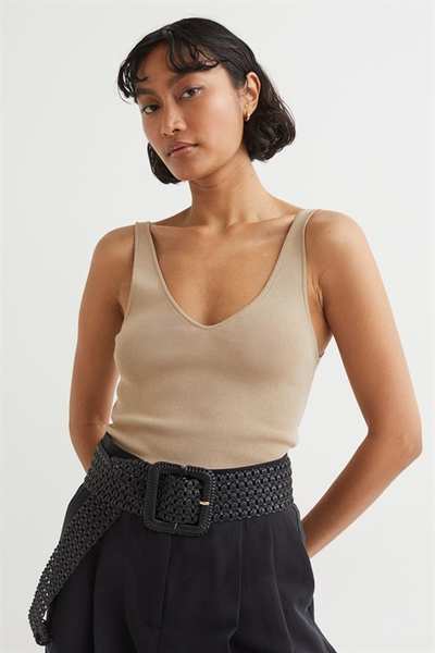 Приталенный топ из мягкого трикотажа с глубоким V-образным вырезом спереди и сзади и глубокими проймами.
